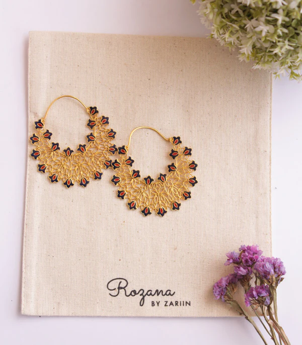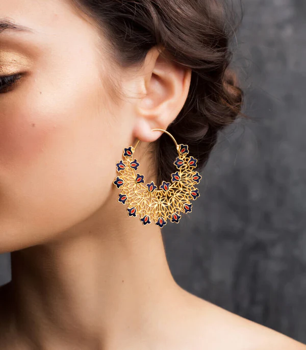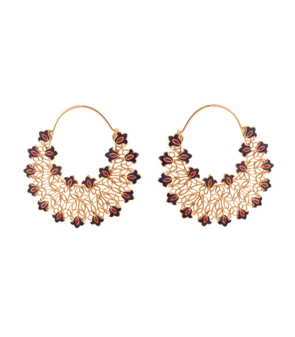 Dramatising the classic hoop style of earrings, is this gorgeous pair of earrings that boasts of striking detail. Intricate filigree detail dressed up with floral motifs lace the hoop earrings. An interesting pair that instantly promises to dress you up and is definitely a class apart from your usual hoops. Statement making at its very best!