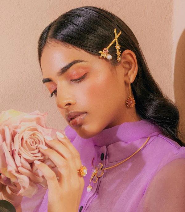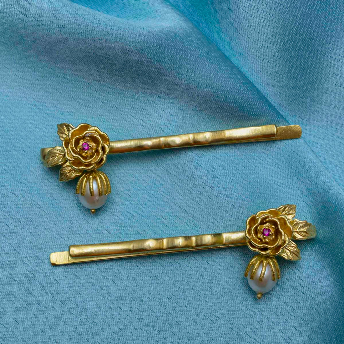 Bobby pins are one of the most versatile form of hair clips to use. The decorative versions of these are one of the most raging trends right now. Zariin introduces a truly luxurious pair of 22kt gold dipped hair clips that have a rose inspired form on one end studded with Pink Zircons and a pearl on the side. Feminine and attaractive, the hair clips add a fancy touch to your hair, irrespective of how you choose to style it.